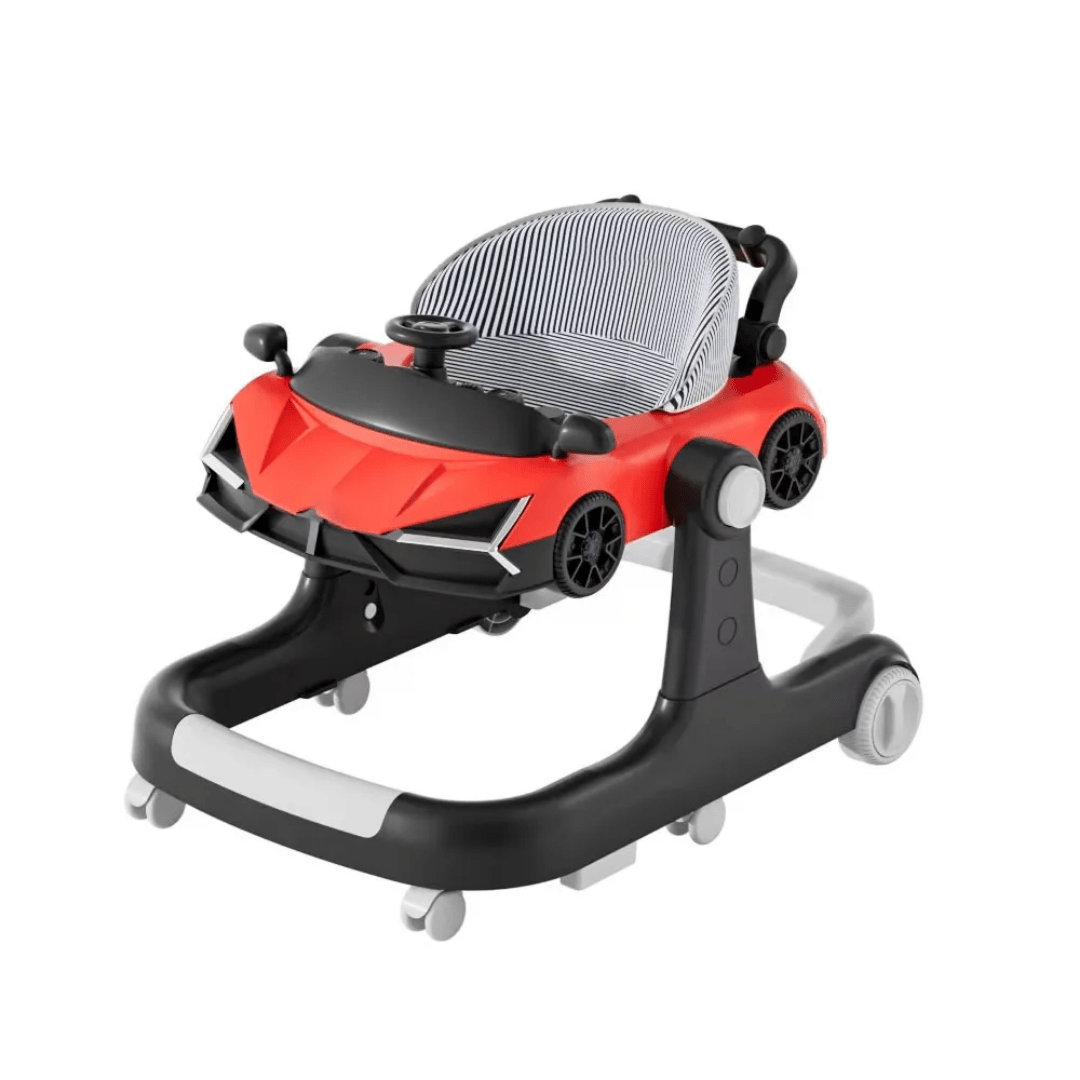 2-in-1 Lambo Sports Car-Inspired Baby Walker & Push-Behind WalkerTurn your little one’s first steps into a joyride with this stylish car-inspired baby walker. Designed for children aged 6 to 24 months, this versatile activity center functions as both a seated walker for beginners and a push-behind walker for toddlers building confidence. It features a comfortable striped seat cushion, a musical toy tray with a steering wheel, and adjustable height settings to grow with your child. The sleek red design and realistic car details make it an exciting addition to any nursery.
